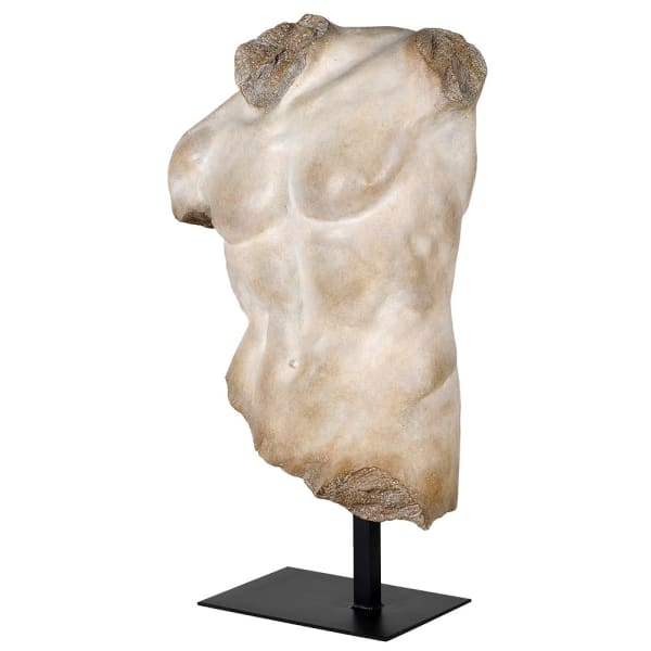 Precyzyjnie odwzorowany męski tors o atletycznych proporcjach podkreśla piękno ludzkiego ciała i siłę formy. Gładkie wykończenie w odcieniach kremu i beżu nadaje rzeźbie elegancki, ponadczasowy charakter, dzięki czemu staje się ona designerską ozdobą wnętrza. Całość osadzona jest na stabilnej podstawie, a wysokość aż 73 cm sprawia, że rzeźba przyciąga uwagę i pełni rolę centralnej dekoracji przestrzeni.