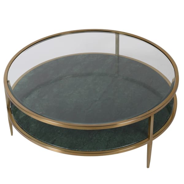 Stolik kawowy Savile Marble 100 cm średnicy zielony marmur szklany blat rama stalowa