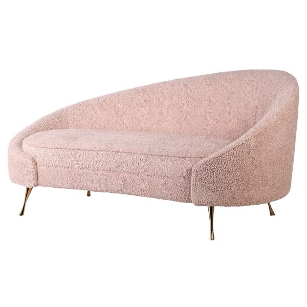 Jeśli lubisz podążać za trendami, sofa pokryta boucle to prawdziwy must have sezonu! Wyróżnia ją nie tylko wykończenie w efektownym jasnym różu, ale także prawdziwie luksusowy, oryginalny kształt i złote subtelne nóżki!