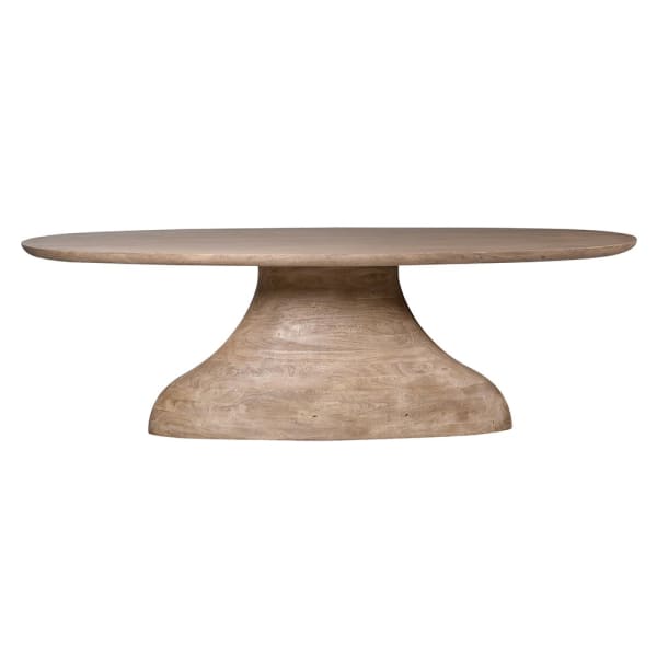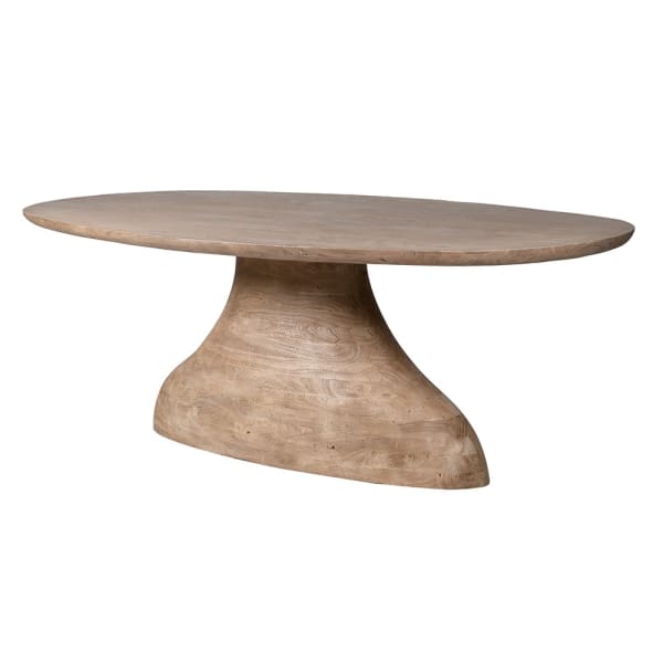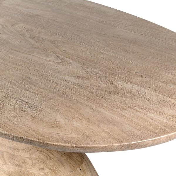 Całość wykonana została z naturalnego drewna akacjowego w ciepłym, piaskowym odcieniu, który podkreśla unikatowy rysunek słojów. Owalny blat o długości aż 240 cm spoczywa na efektownej, rzeźbiarskiej podstawie w formie jednej, masywnej nogi. Takie rozwiązanie nie tylko nadaje meblowi charakteru, ale także zapewnia więcej swobody w ustawieniu krzeseł wokół stołu!