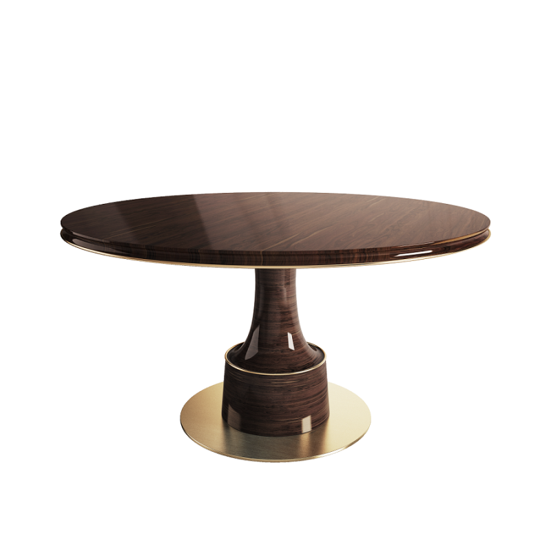 Podstawa tego eleganckiego stołu do jadalni wykonana jest ze szczotkowanego mosiądzu, który doskonale kontrastuje z drewnem konstrukcji.