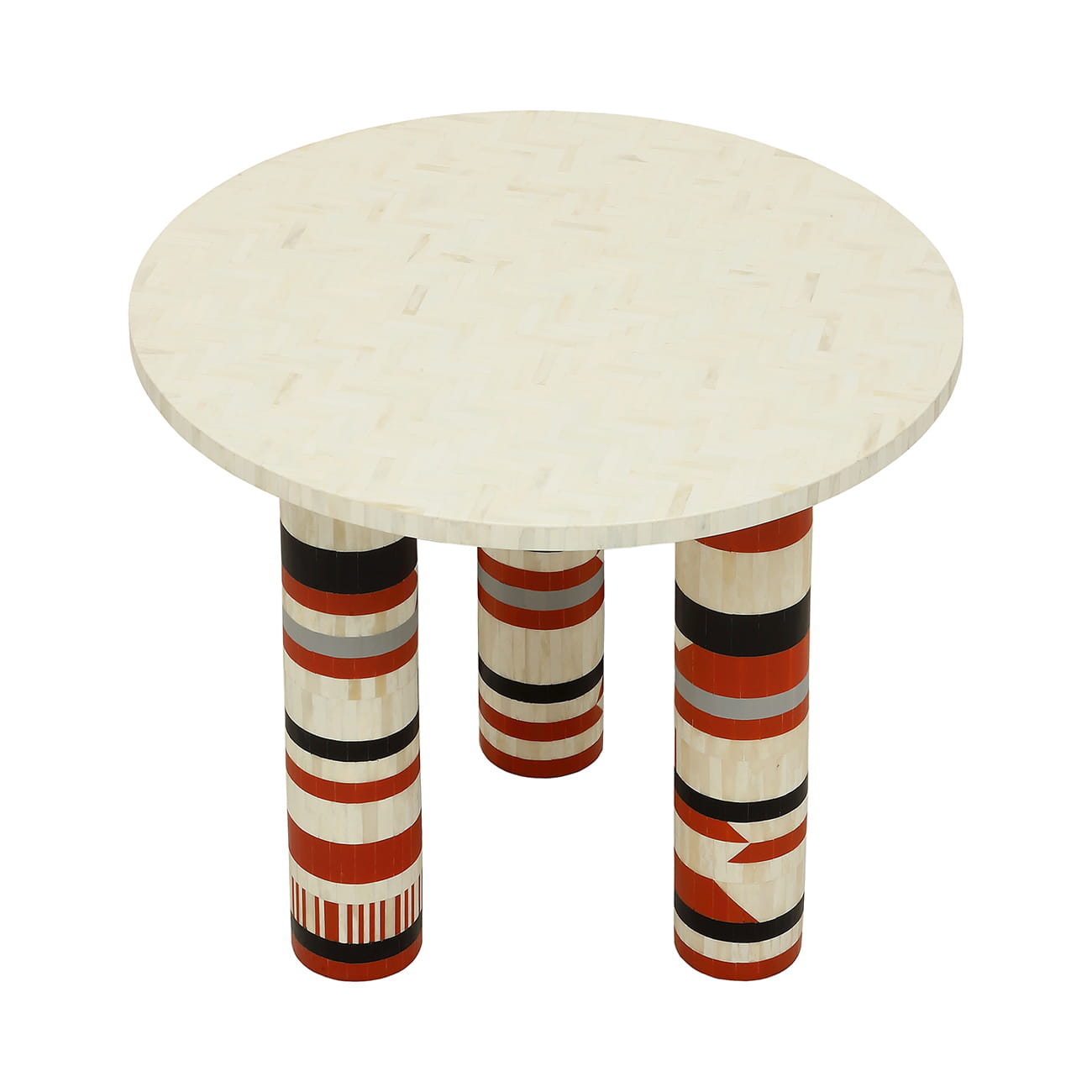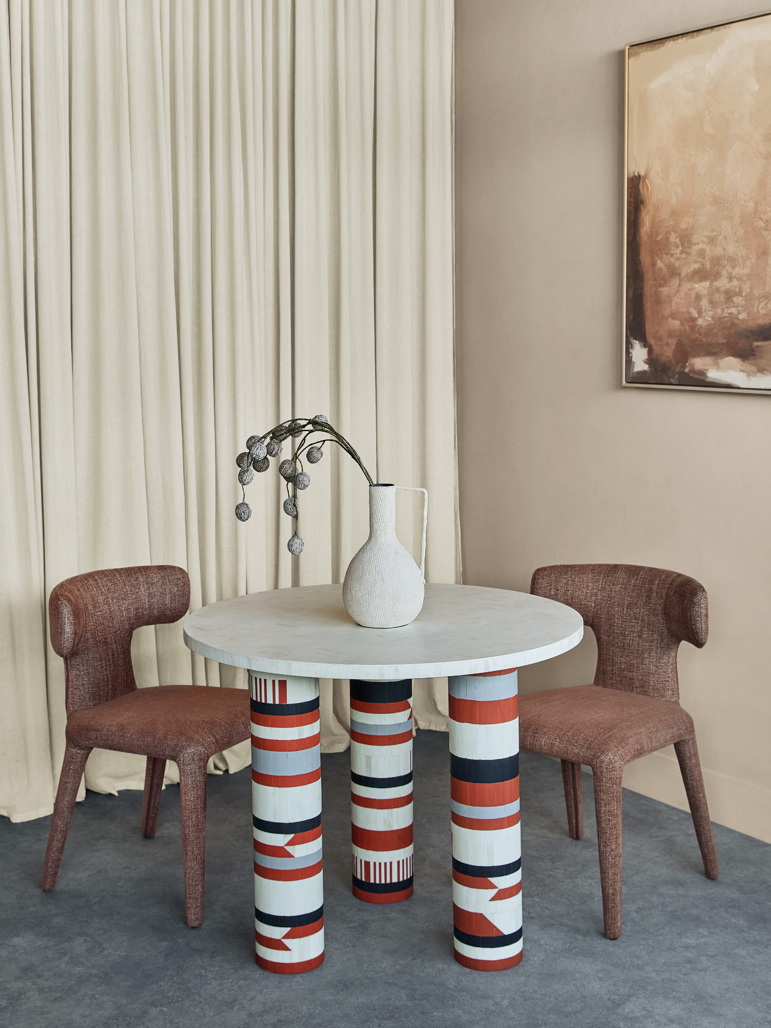 Blat stołu wykonany został z ręcznie układanej kości w kremowym odcieniu, tworząc elegancką, subtelną powierzchnię o naturalnej fakturze. Trzy cylindryczne nogi zachwycają misterną intarsją w tonacjach terakoty, czerni, kości słoniowej oraz miękkiej szarości, układającą się w geometryczne pasy o dynamicznym rytmie.