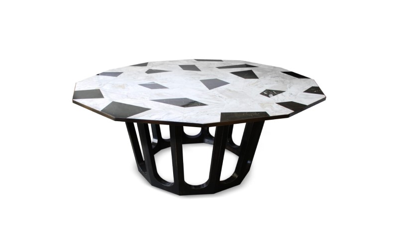 Stół do jadalni Northup to bardzo elegancki i stylowy wybór do zaimponowania w każdej współczesnej przestrzeni życiowej. Blat został utworzony z dwóch rodzajów marmuru - Marquina i Calacatta, które tworzą geometryczny wzór. Rama stołu to mosiądz pokryty ręcznie ciemną terakotą.