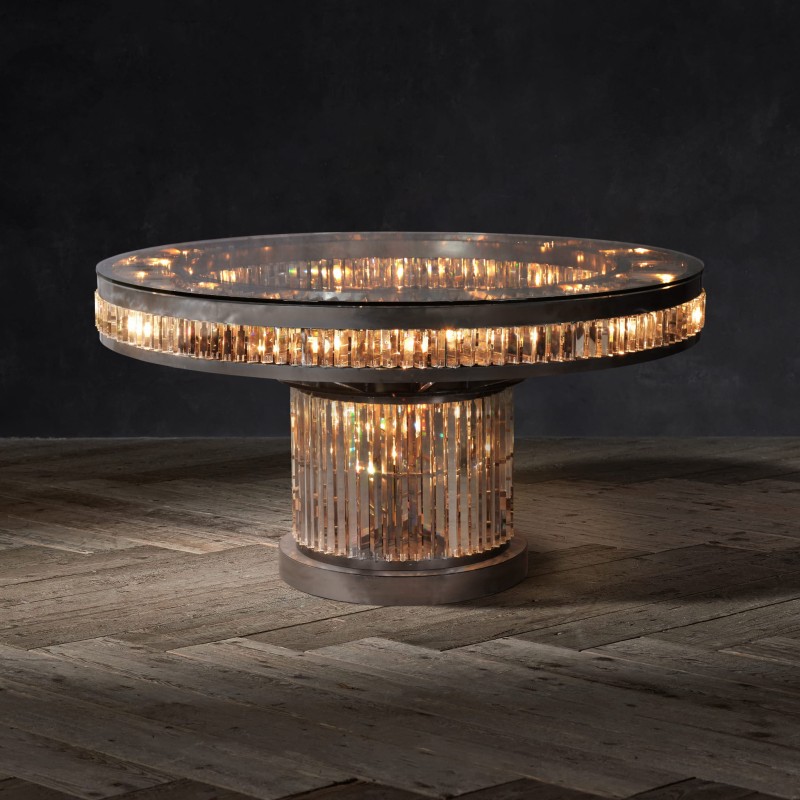 Odkryj luksusowe meble do eleganckiego wnętrza salonu. Nietuzinkowe i całkowicie unikatowe meble wykonane z wysokiej jakości szkła optycznego. Piękny okrągły stół do jadalni o średnicy 158 cm zachwyca efektownym podświetleniem LED