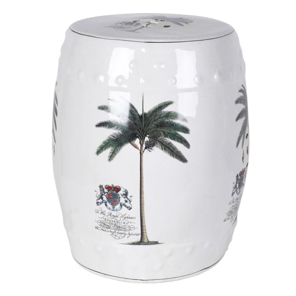 Stołek ceramiczny Palm to dekoracyjny i funkcjonalny mebel, który sprawdzi się zarówno we wnętrzach, jak i na zadaszonym tarasie czy balkonie. Wykonany z wysokiej jakości ceramiki, zachwyca eleganckim wykończeniem oraz egzotycznym wzorem z motywem palmy w odcieniach bieli i zieleni.