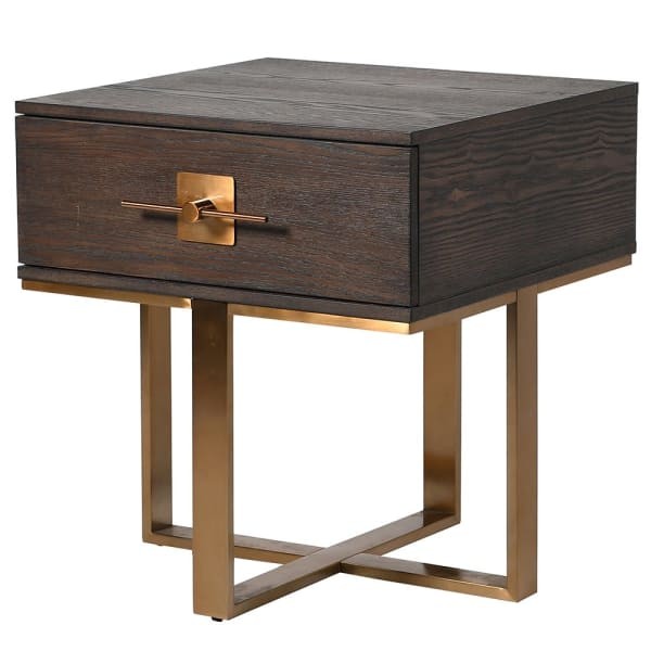 Stolik wykonany jest z wysokiej jakości materiałów: forniru jesionowego w głębokim odcieniu ciemnego brązu, MDF oraz stali nierdzewnej w kolorze ciemnego złota. Dekoracyjna szuflada z eleganckim uchwytem nie tylko podkreśla unikalny styl mebla, ale również zapewnia praktyczne miejsce do przechowywania najpotrzebniejszych przedmiotów – od książek i ładowarek po kosmetyki czy okulary.