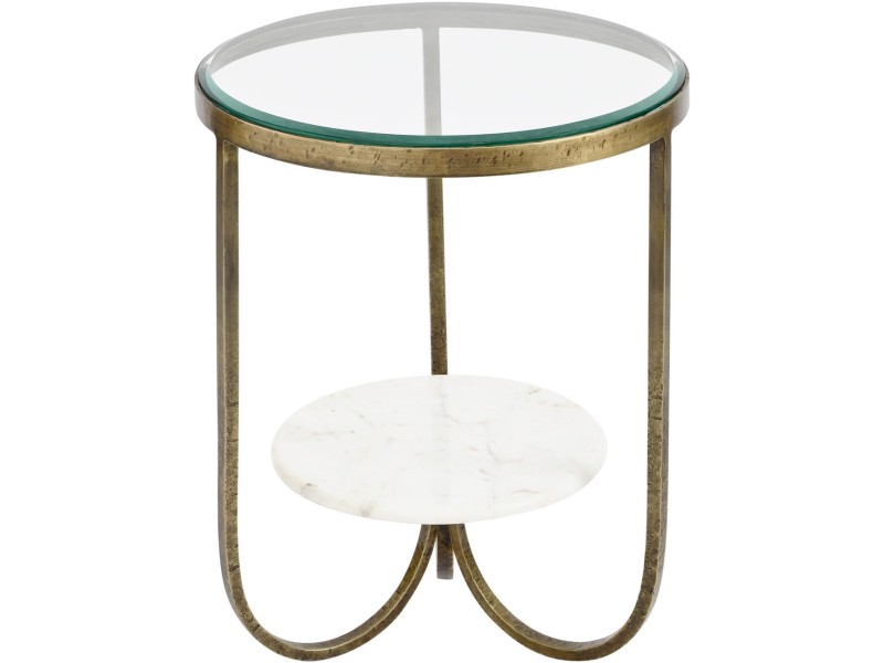Okrągły, szklany blat o średnicy 50,5 cm został osadzony w solidnej, żelaznej ramie wykończonej ręcznie w szlachetnym odcieniu starego złota. Wewnątrz konstrukcji znajduje się marmurowa półka z białego kamienia naturalnego, która nadaje całości luksusowego charakteru i wyróżnia ten mebel na tle klasycznych stolików pomocniczych.
