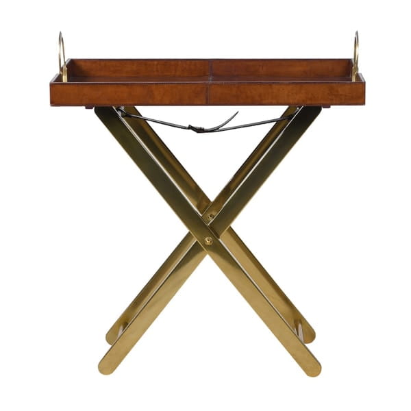 Ten przyciągający wzrok mebel wyposażony został w złotą podstawę ze skrzyżowanymi nogami wykonaną ze stali. Skórzana taca pełniąca funkcję blatu może być łatwo zdjęta i używana do serwowania. Designerski kształt całości tego stolika-tacy potęgują dekoracje stalowe uchwyty - również wykończone w złocie. Odcień metalowych elementów tego stolika doskonale komponuje się z brązową skórą naturalną.