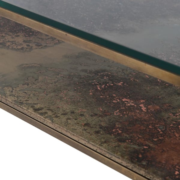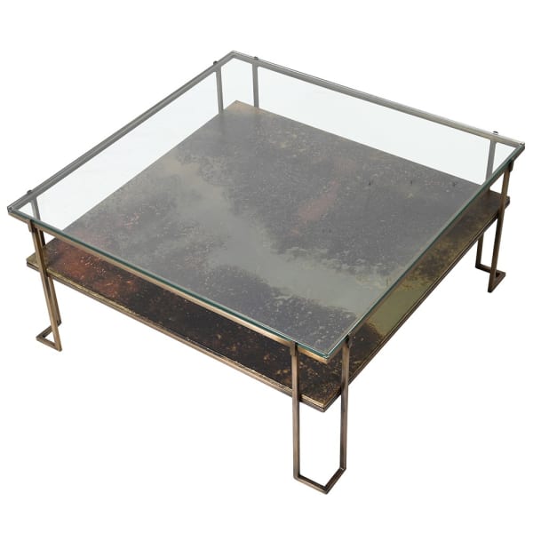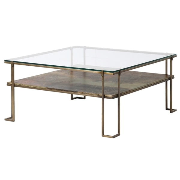Elegancki, kwadratowy stolik kawowy ze szklanym blatem umieszczonym na żelaznej ramie w pięknym odcieniu postarzanego złota. Ten piękny stolik do salonu wyróżnia się zdobioną półką, która będzie nie tylko dekoracyjnym elementem w salonie, ale okaże się bardzo praktyczna w codziennym funkcjonowaniu.