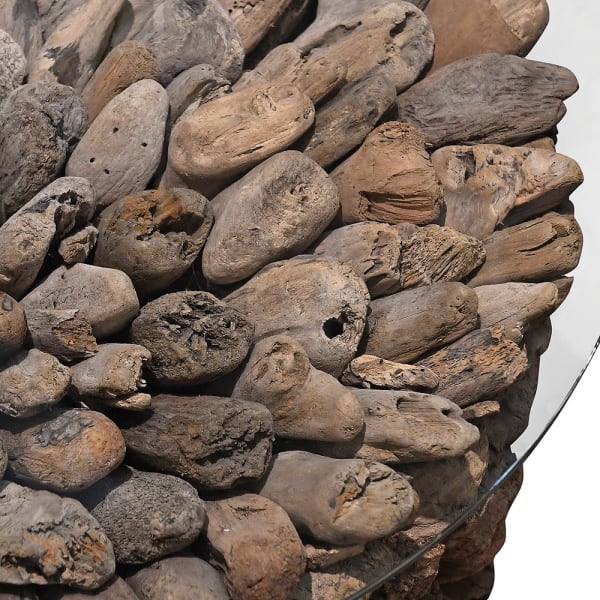 Okrągły stolik kawowy Boho 75 cm driftwood podstawa drewniana szklany blat