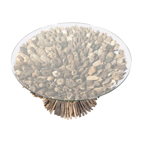 Okrągły stolik kawowy Hayes 75 cm driftwood podstawa drewniana szklany blat