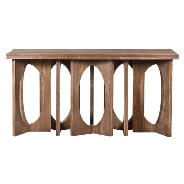 Konsola drewniana Reclaimed to wyrazisty mebel do wnętrz, wykonany z wysokiej jakości drewna wiązu z odzysku. Przyciąga uwagę naturalnym wybarwieniem, oryginalnym rysunkiem słojów oraz efektowną, geometryczną podstawą z dekoracyjnymi wycięciami. To propozycja dla osób, które szukają mebla o zdecydowanym charakterze i chcą stworzyć elegancką, dopracowaną aranżację.