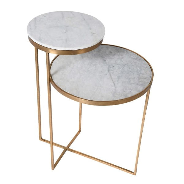 Stolik boczny Marble Gold został wykonany z żelaza w złotym kolorze oraz naturalnego marmuru w odcieniu bieli. Jasny blat i połyskująca rama pięknie odbijają światło, dzięki czemu stolik świetnie prezentuje się zarówno w przestronnych, jak i mniejszych wnętrzach. Ręczne wykończenie podkreśla jego ekskluzywny charakter i sprawia, że jest to mebel klasy premium do eleganckiego domu lub apartamentu.
