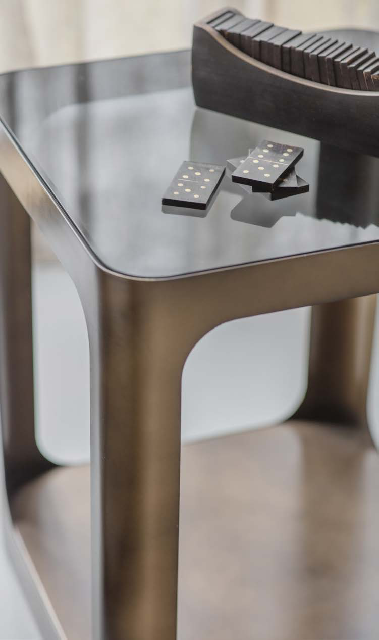Stolik boczny Kensington Gold to harmonijne połączenie nowoczesnej formy z eleganckimi, luksusowymi detalami. Jego ciemne, dymione złoto nadaje mu wyjątkowego szyku, a blat z hartowanego szkła o ciemnej barwie dodaje subtelnej lekkości i głębi. Czyste, geometryczne linie i doskonała symetria sprawiają, że stolik pomocniczy staje się ponadczasowym elementem wystroju, który wnosi do wnętrza wyrafinowanie i nowoczesny charakter.