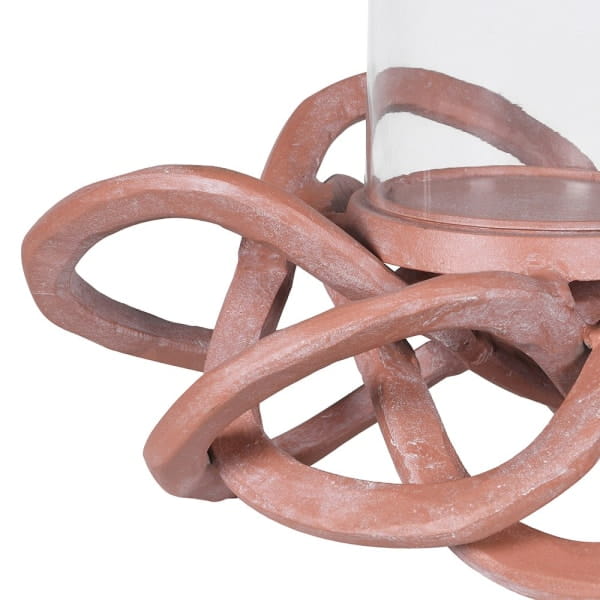 Szklany klosz umieszczony na aluminiowej podstawie w odcieniu terakoty zapewnia miejsce na dużą świecę. Ten oryginalny, ręcznie wykończony świecznik będzie pięknym dodatkiem do jadalni lub salonu.