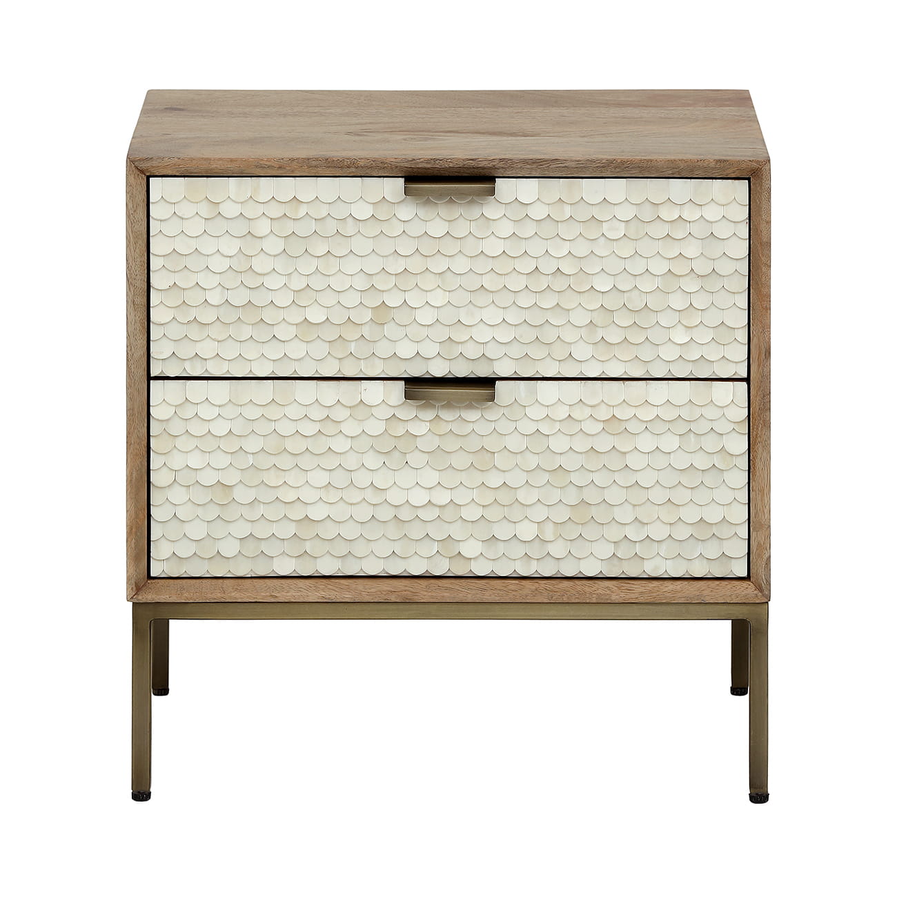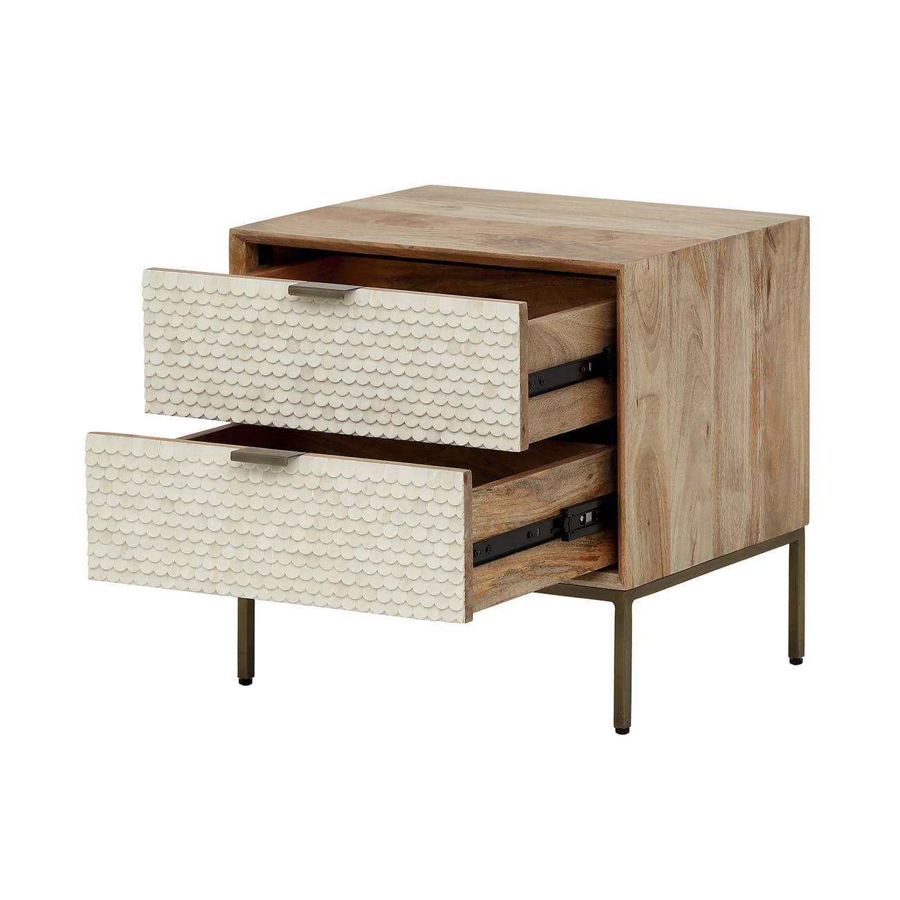 Stolik nocny Chesham – designerski stolik z intarsją kostną i drewnem mango