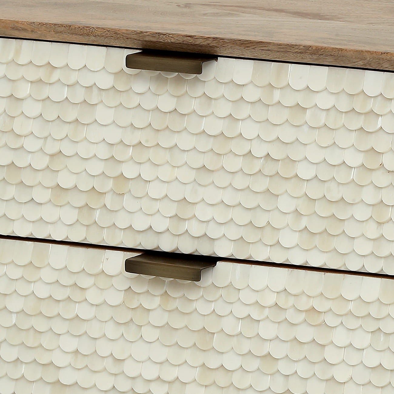 Fronty szuflad zostały ozdobione ręcznie aplikowaną intarsją z kości o delikatnym, falistym wzorze. Taka struktura tworzy miękki rytm i efekt trójwymiarowości, nadając meblowi dekoracyjny charakter, który jednocześnie pozostaje subtelny i elegancki.