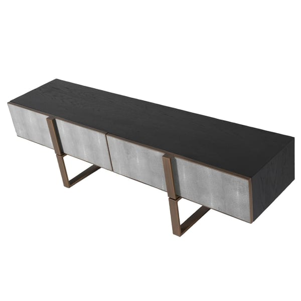 Szafka RTV Enderby II 180 cm komoda pod telewizor szary szagryn dąb złote detale żelazo