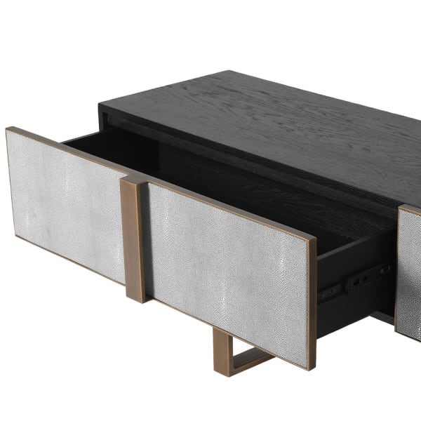 Fronty wykonane z materiału shagreen i korpus wykończony dębem sprawiają, że mebel świetnie komponuje się z wnętrzami w stylu glamour, modern classic, premium oraz nowoczesnymi aranżacjami inspirowanymi designem hotelowym. Szafka pozwala stworzyć eleganckie centrum domowej strefy wypoczynku.