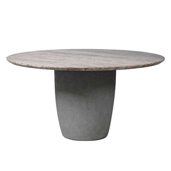 Ten szary okrągły stół do jadalni to propozycja dla wnętrz, w których liczy się szlachetna prostota, dopracowana forma i naturalne materiały. Blat z trawertynu zestawiono z solidną, centralną podstawą z cementu, tworząc mebel o rzeźbiarskim charakterze i ponadczasowej estetyce. Dzięki stonowanej kolorystyce w odcieniach szarości stół doskonale wpisuje się w nowoczesne, minimalistyczne oraz luksusowe aranżacje.