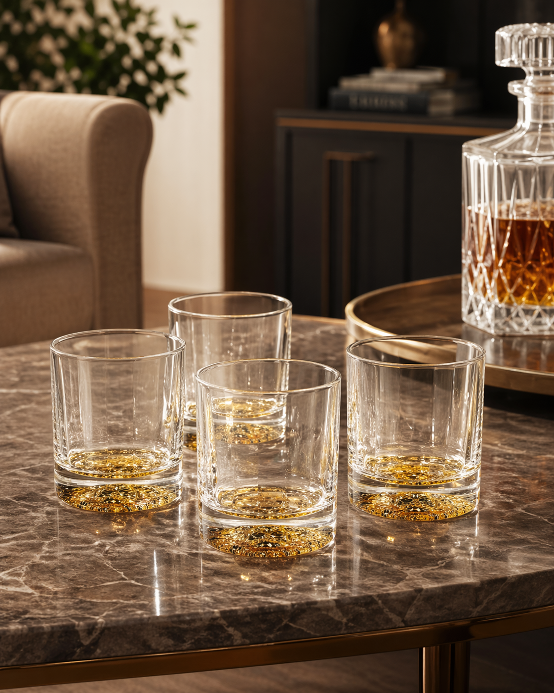Złote szklanki do drinków K&B London to propozycja dla osób, które szukają nie tylko praktycznego szkła, ale też dekoracyjnego elementu stołu. Dzięki połączeniu przezroczystego szkła, złotego detalu i ozdobnego dna komplet dobrze wpisuje się w aranżacje glamour, modern classic oraz wnętrza o eleganckim charakterze.