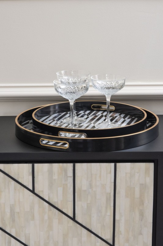 Niezwykle elegancki zestaw dwóch tac (większa ma średnicę 46 cm), które zostały ręcznie wykończone w kolorze czerni oraz antycznego złota.