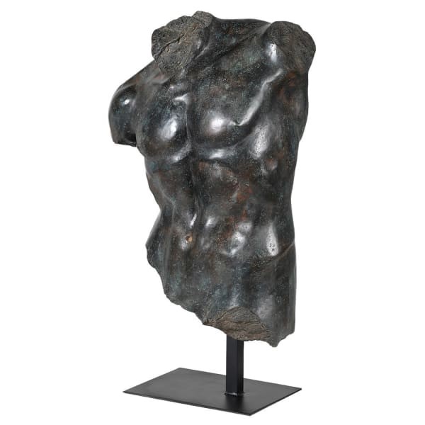 Rzeźba wykończona w ciemnych barwach, z gładkim wykończeniem prezentuje się niezwykle efektownie. Prezentując umięśniony fragment męskiego torsu ta rzeźba stanowi ukłon w stronę atletycznych kształtów ludzkiego ciała. Wykończona w odcieniach szarości, czerni i brązu ta efektowna rzeźba na podstawie ma wysokość aż 73 cm!