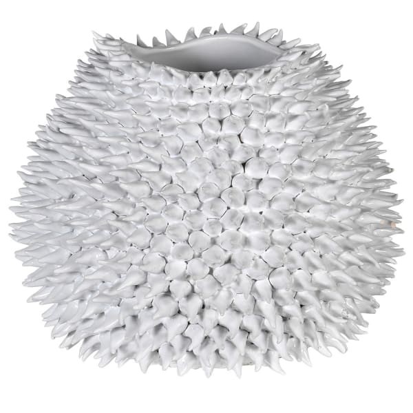 Luksusowy wazon wykończony w odcieniu bieli inspirowany kształtem morskiego jeżowca. Ten ceramiczny wazon będzie ozdobą salonu lub stołu w jadalni