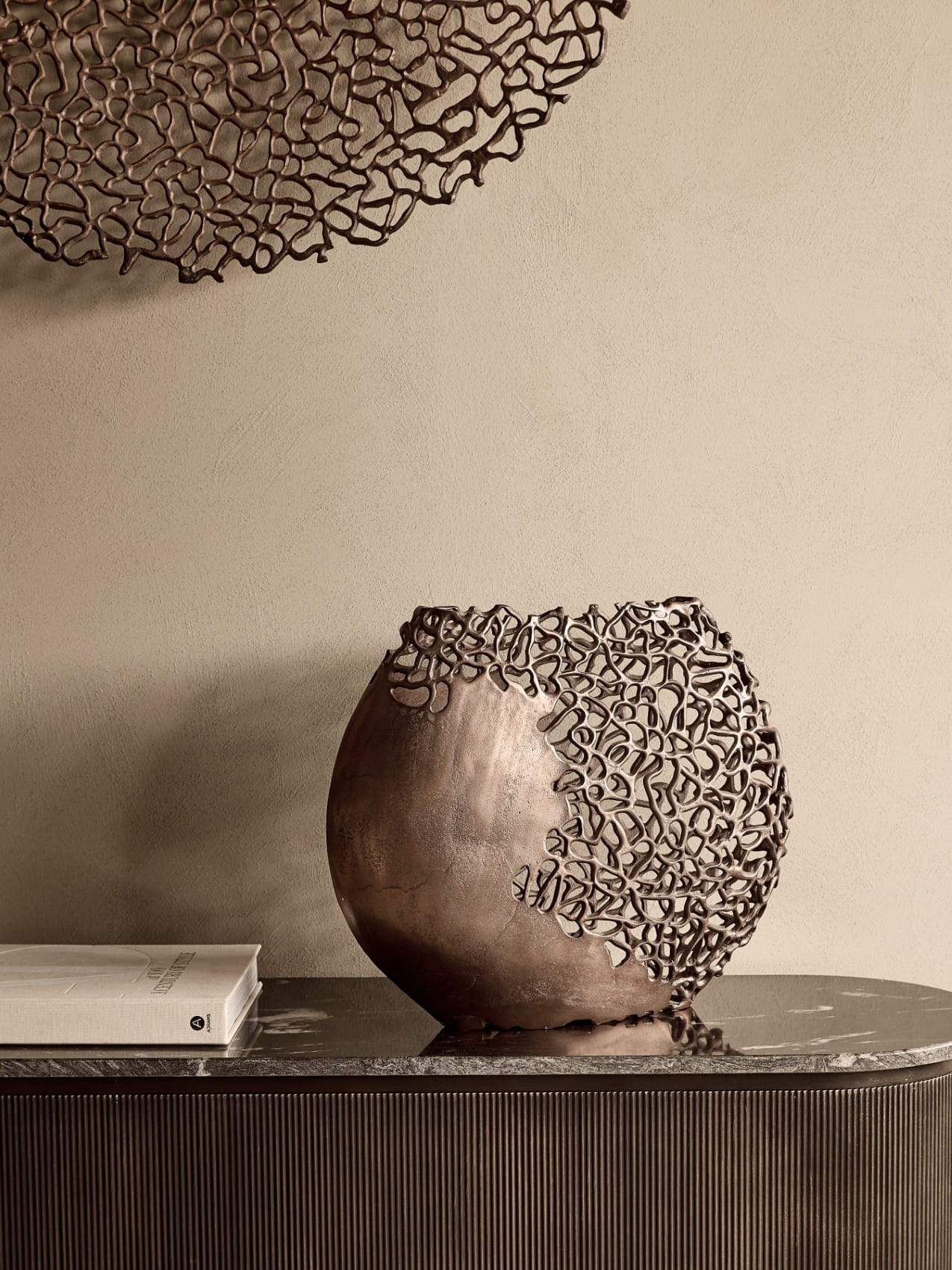 Wykonany z aluminium i utrzymany w szlachetnym, brązowym odcieniu, model Chelsea przyciąga uwagę bogactwem detalu i subtelną, organiczną linią. Ażurowy wzór zdobi część powierzchni, nadając całości lekkości i artystycznego wyrazu. Ten wazon metalowy pięknie prezentuje się jako samodzielna ozdoba, ale równie dobrze może stanowić bazę dla suchych kompozycji lub sztucznych kwiatów.