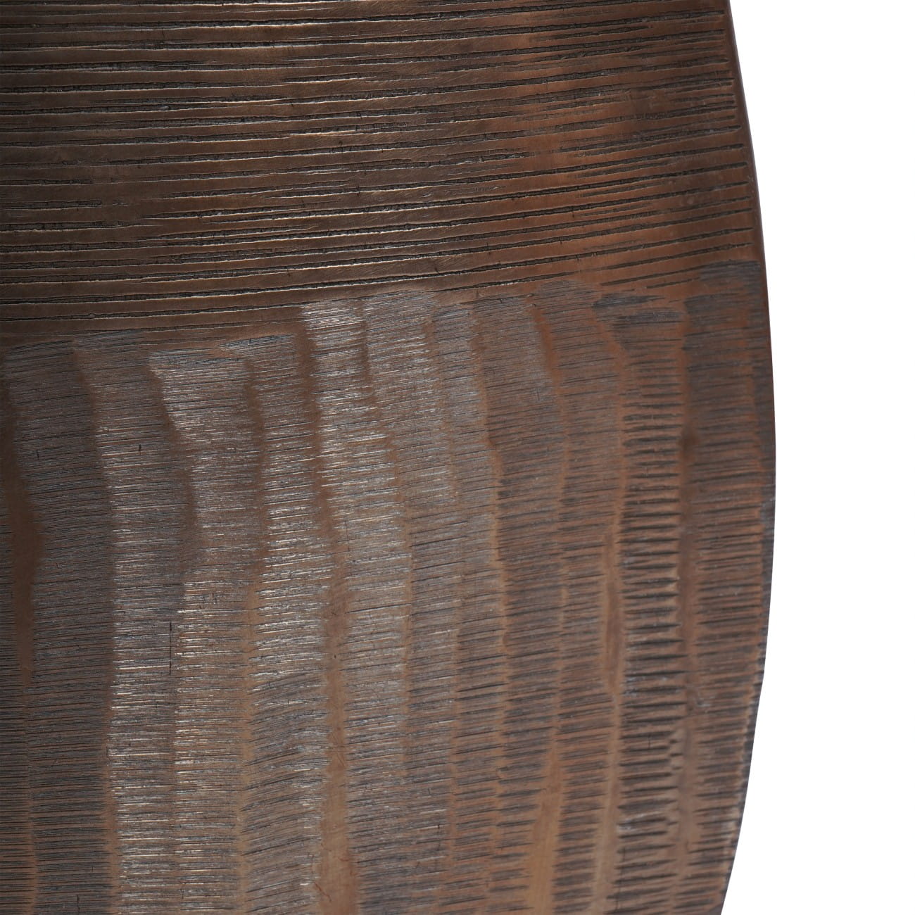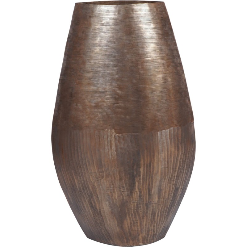 Smukły, owalny kształt wazonu przypominający beczkę został wzbogacony o misternie wykonane, ręczne teksturowanie, które nadaje mu niepowtarzalny i wysublimowany charakter. Precyzyjne detale podkreślają jego urok, łącząc efekt postarzenia z wyrafinowaną estetyką. Mimo swoich pokaźnych rozmiarów, ten złoty wazon jest lekki i łatwy do ustawienia w dowolnym miejscu.