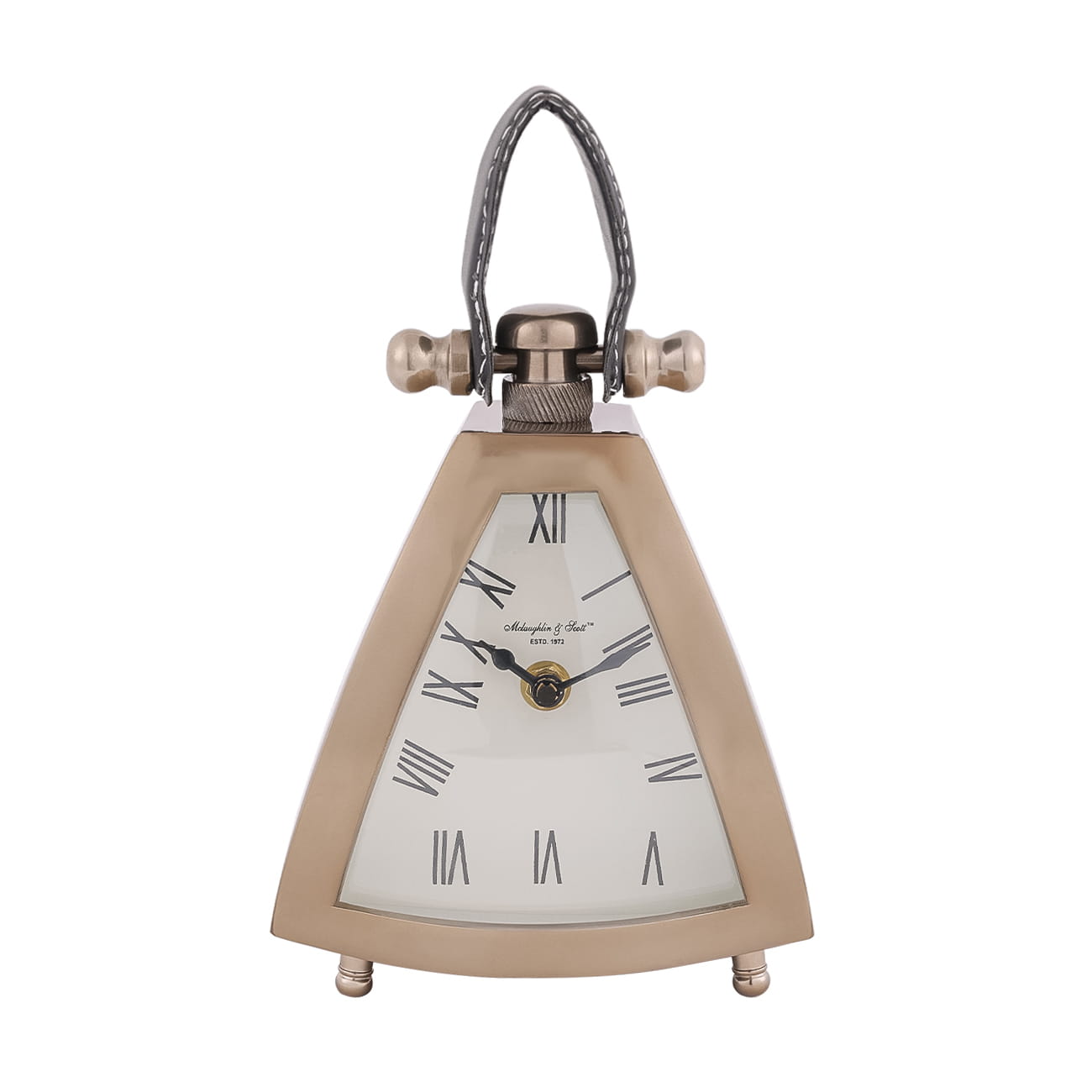 Złoty zegar na biurko Eaton o wysokości 18 cm stanowi ekskluzywny dodatek wystroju. Ten zegar na komodę wykonany został ze stali i aluminium, z ozdobną, skórzaną zawieszką i trójkątną tarczą.