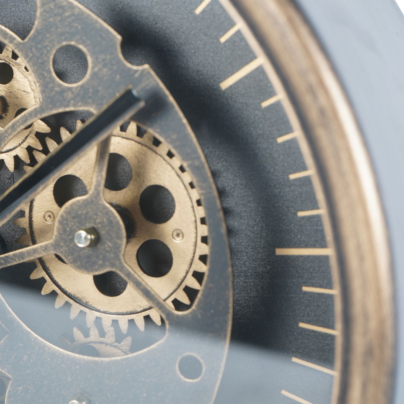 Zegar stojący o oryginalnym kształcie i pięknych barwach. To arcydzieło wykracza poza zwykłe mierzenie czasu, zapraszając do podziwiania swojego wnętrza przez szkło, gdzie hipnotyzujące trybiki tańczą w harmonii. Wykonany z dbałością o najdrobniejsze szczegóły, ten zegar stojący wyposażono w subtelne kreski zastępujące tradycyjne liczby. Całość wykończona w stylu szczotkowanego antycznego starego złota i czerni.