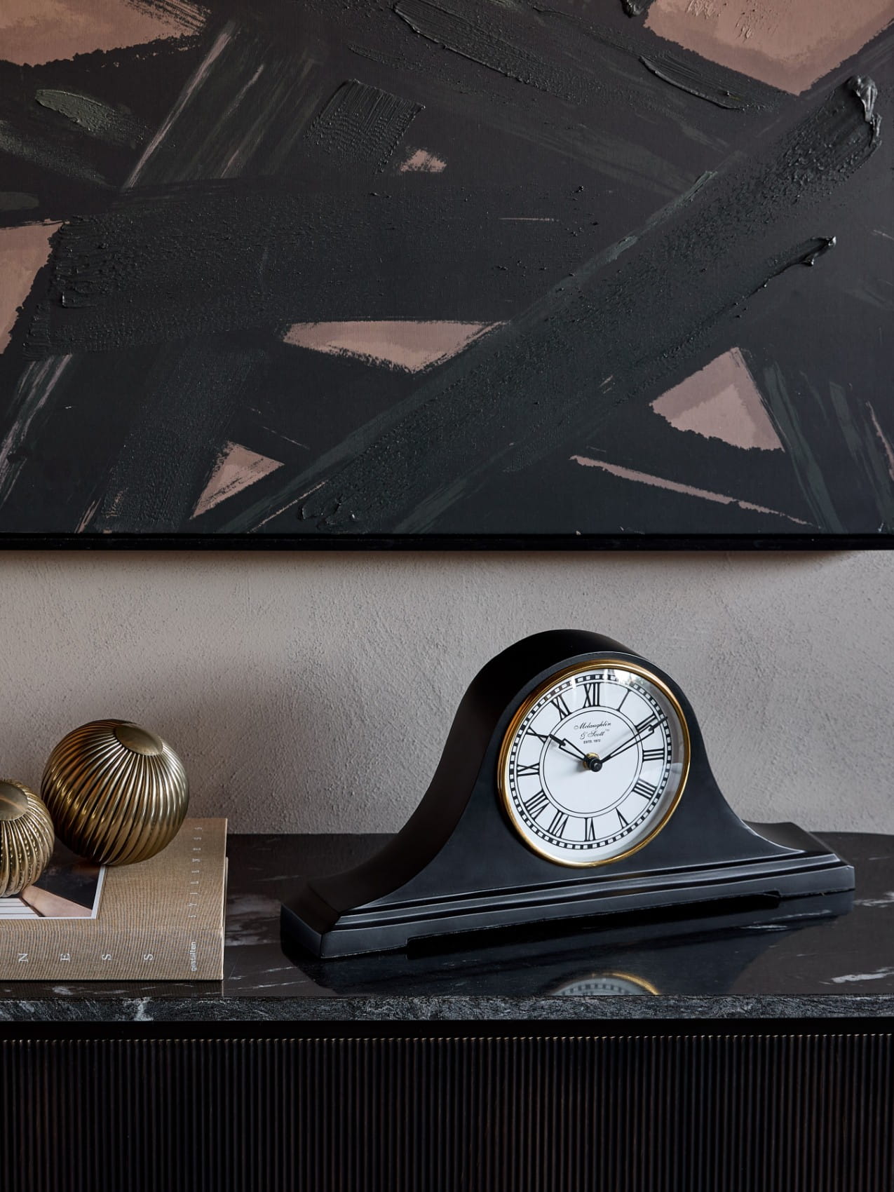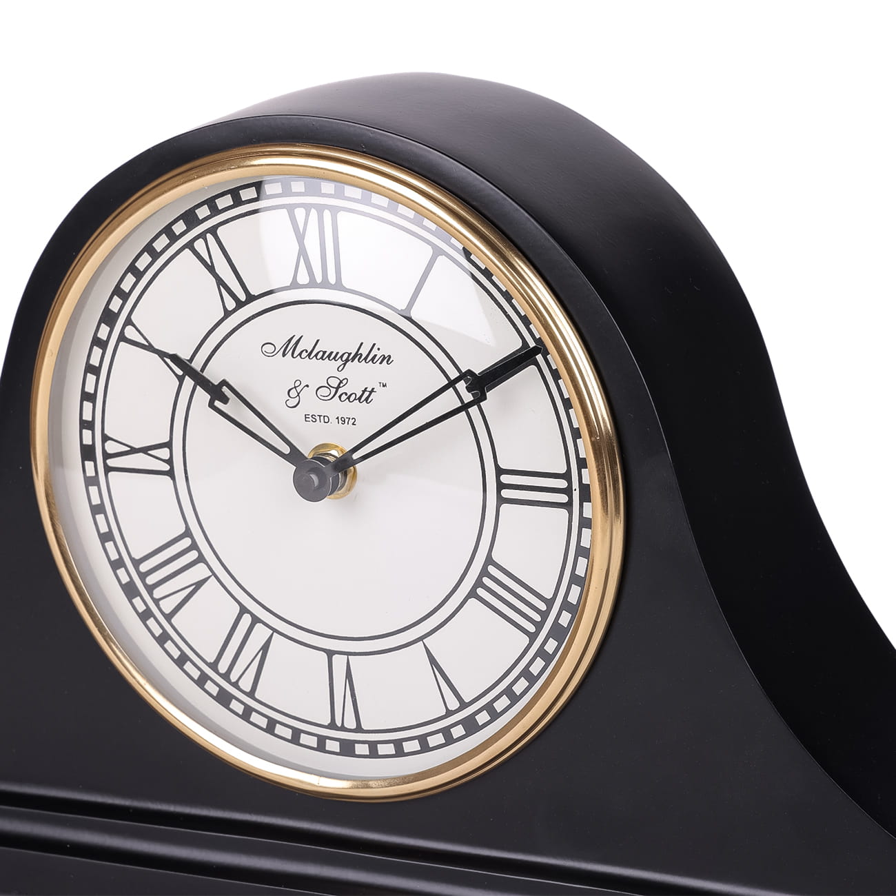 Zegar na kominek wykonany z aluminium został wykończony w eleganckim, satynowym, czarnym odcieniu. Klasyczny kształt tego niskiego zegara nawiązuje do dawnej stylistyki efektownych zegarów, które pojawiały się w luksusowych gabinetach i salonach. Biała tarcza posiada rzymskie czarne cyfry.