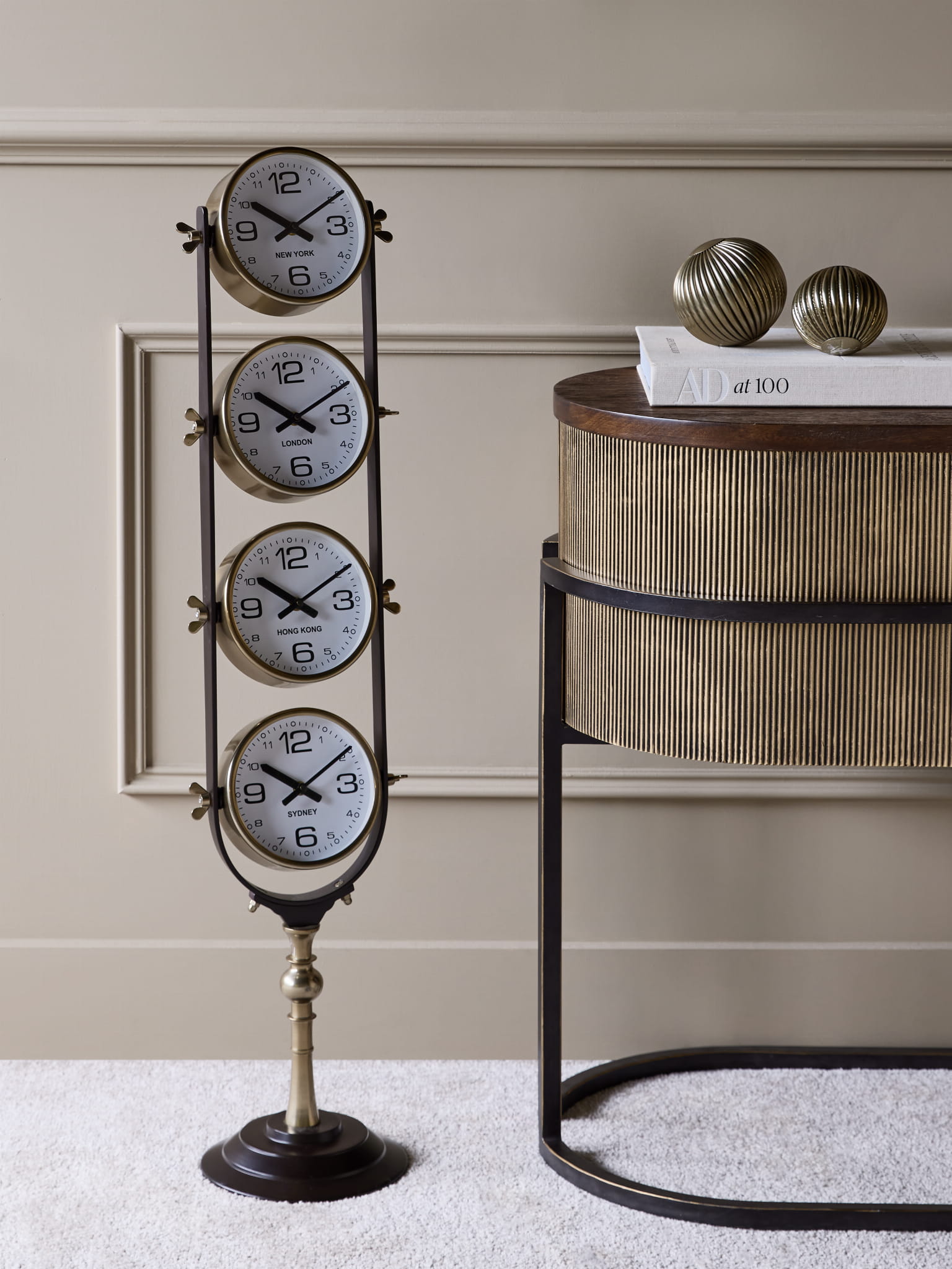 Chester to wyjątkowy zegar stojący, który łączy w sobie wyrafinowany styl industrialny z kosmopolitycznym charakterem. Smukła rama wykonana z aluminium i stali nierdzewnej mieści cztery tarcze ułożone pionowo, z których każda wskazuje czas w innym mieście świata – Nowym Jorku, Londynie, Hongkongu i Sydney.