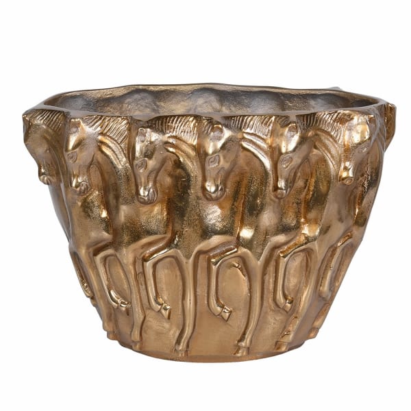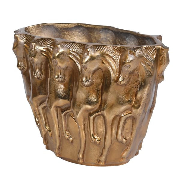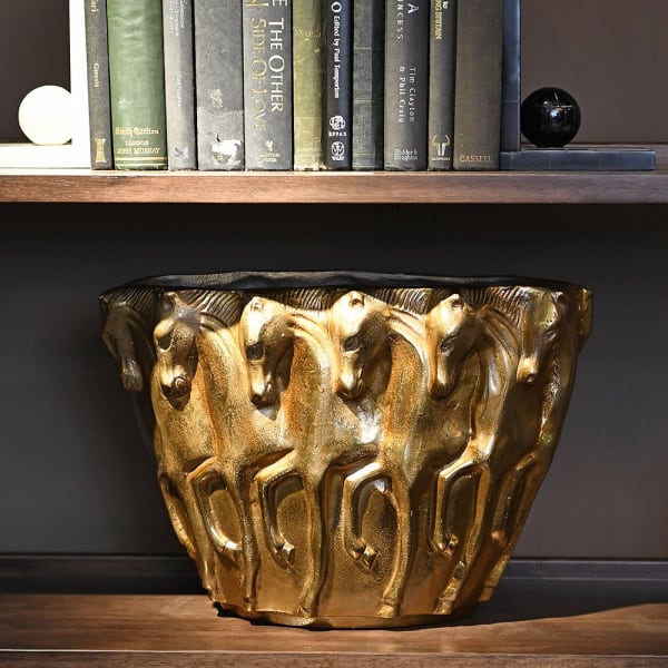 Ta metalowa luksusowa waza dekoracyjna wyróżnia się efektownym odcieniem postarzanego mosiądzu oraz motywem odlewanych koni.