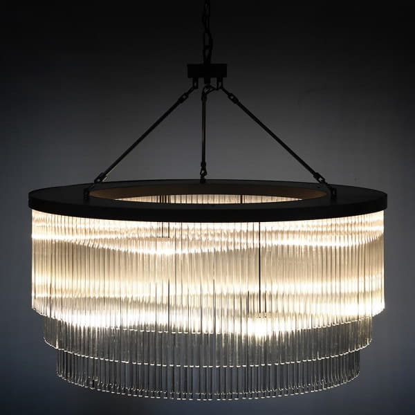Duży żyrandol o średnicy 90 cm stanie się centralnym punktem aranżacji – idealnym do salonu, jadalni lub przestronnego holu. Zawieszony jest na czarnym łańcuchu o regulowanej długości do 155 cm, co pozwala dopasować wysokość do każdego pomieszczenia. Połączenie szkła i czarnego żelaza tworzy unikatowe połączenie nowoczesności z elegancją.