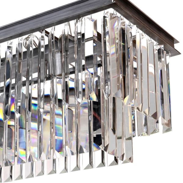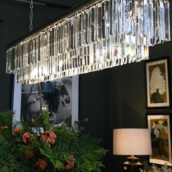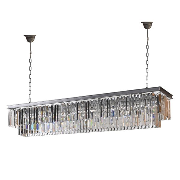 Ta imponująca lampa wisząca to idealne połączenie elegancji, luksusu i nowoczesnego designu. Jej wydłużony, prostokątny kształt oraz efektowne, podłużne kryształy o szlifie fasetowym sprawiają, że światło pięknie się rozprasza, tworząc zjawiskową grę refleksów. Doskonale sprawdzi się nad stołem w jadalni, wyspą kuchenną czy w reprezentacyjnym salonie. Wysokiej jakości wykończenie w kolorze chromu w połączeniu z przezroczystymi kryształami dodaje całości wyrafinowanego charakteru. Solidna konstrukcja podwieszona na dwóch łańcuchach zapewnia stabilność oraz możliwość regulacji wysokości.