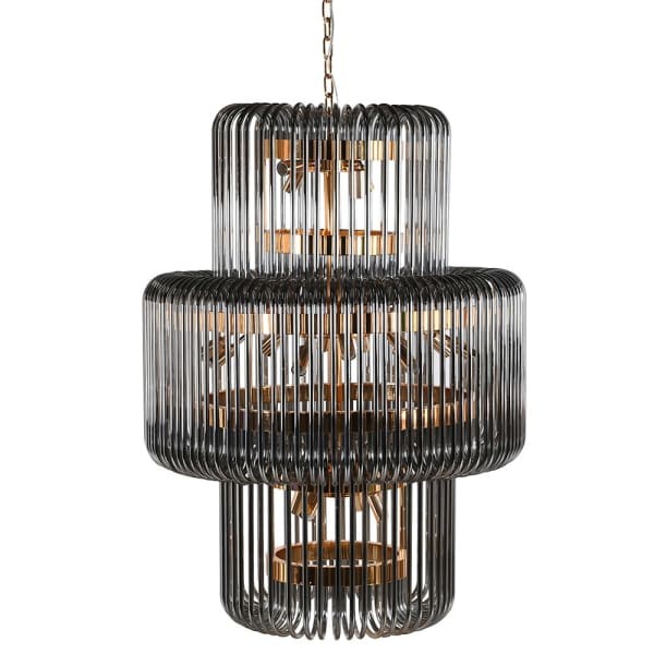 Elegancki i przyciągający wzrok czarny żyrandol do salonu, wykonany z przydymionego, ciemnego szkła ze złotymi refleksami. Ten duży żyrandol sufitowy został zaprojektowany tak, aby stać się centralną ozdobą wnętrza i podkreślić jego luksusowy charakter.